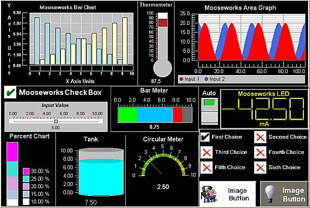 The Instrumentation Control suite includes everything you need to create eye catching and easy to use displays. The suite includes advanced charting capabilities, graphical meters, switches and sliders for user interaction, image buttons, user entry controls for advanced formatting, serial port controls for hardware communications, and encryption controls for devices and desktop. All controls are 100% native .Net, so there are no unmanaged dlls to create deployment worries. No redistribution licensing fees and free updates for one full year. Mooseworks Software stands behind our controls,